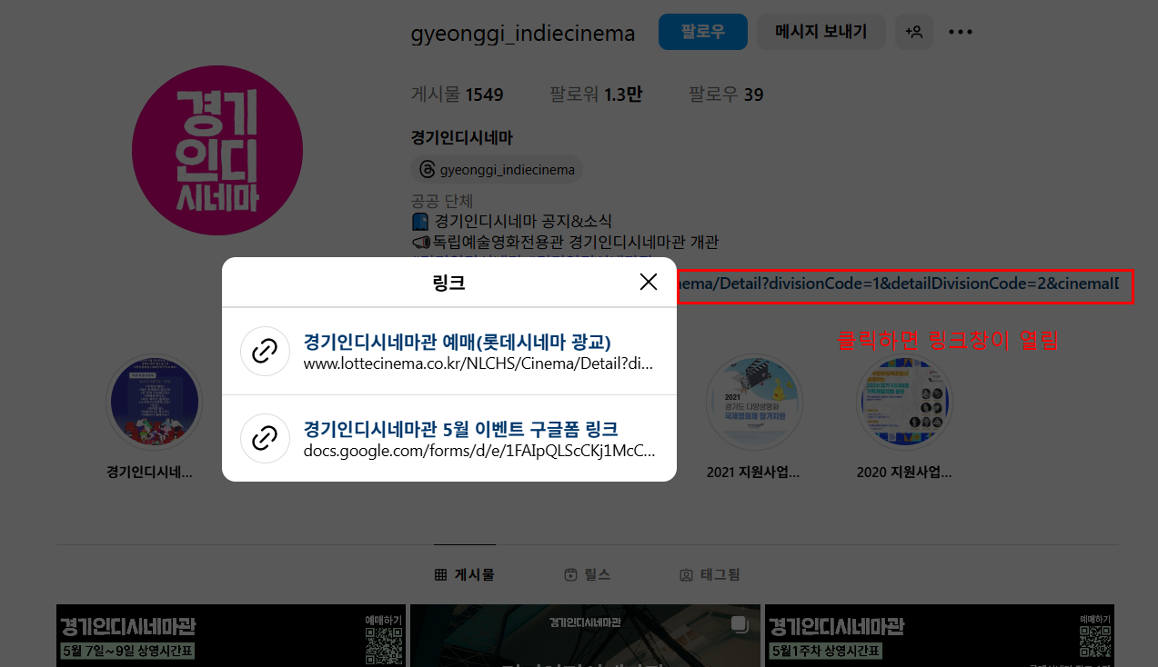 3. 경기인디시네마 인스타그램 프로필 링크 > 구글폼 링크 클릭 → 게시물 URL과 연락처 기입