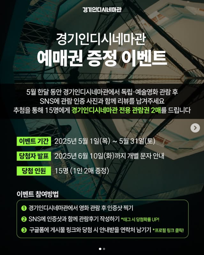 경기인디시네마 관람 후 SNS에 인증샷과 리뷰를 남기면, 추첨을 통해 총 15명에게 예매권 2매(1인 2장)를 드립니다.