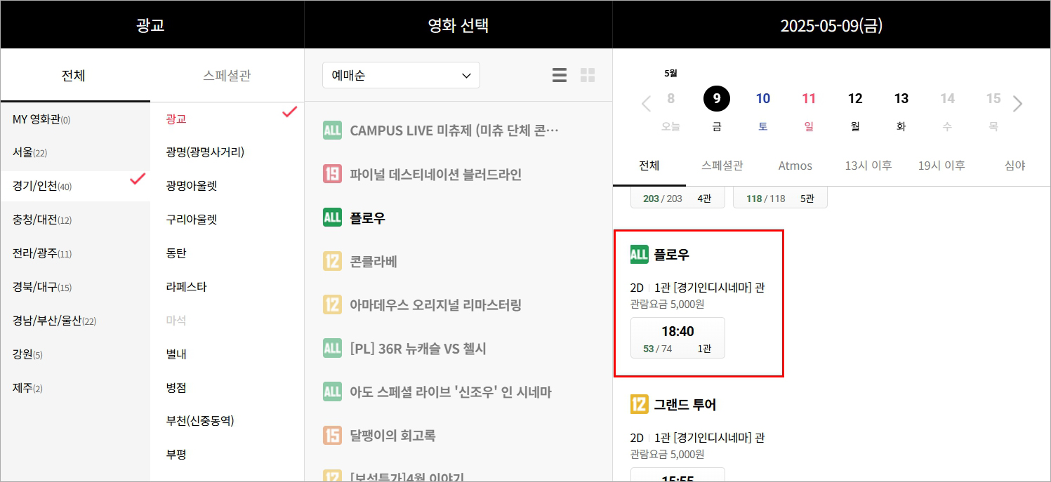 예매는 롯데시네마 웹/앱에서 ‘광교관’ > ‘ 1관 [경기인디시네마]’ 표시 영화 선택!
