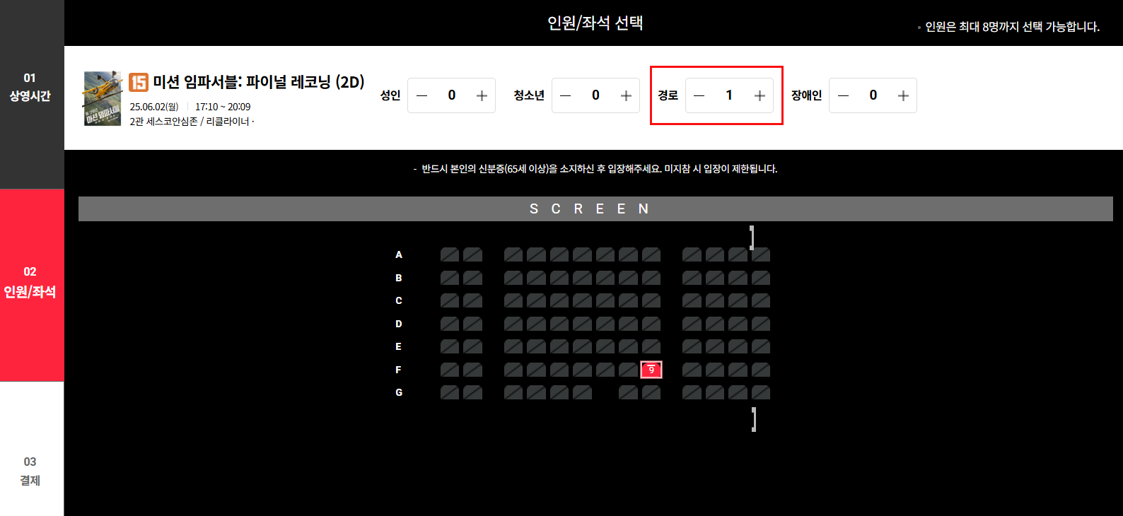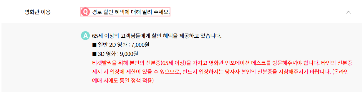 • 온라인 예매 시: 예매 과정에서 '경로'를 선택하고, 영화관 방문 시 신분증을 제시하여 확인받아야 합니다.