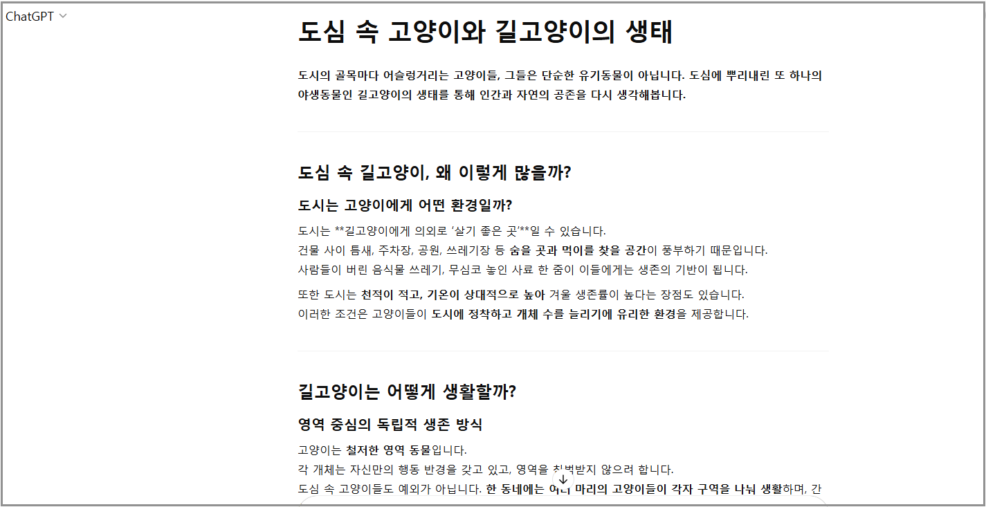 - H2: 주요 섹션 제목 ( 예: 도시는 고양이에게 어떤 환경일까?)