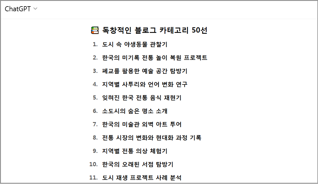 카테고리명을 메인주제로 넣습니다.(예: 도시 속 야생동물 관찰기)