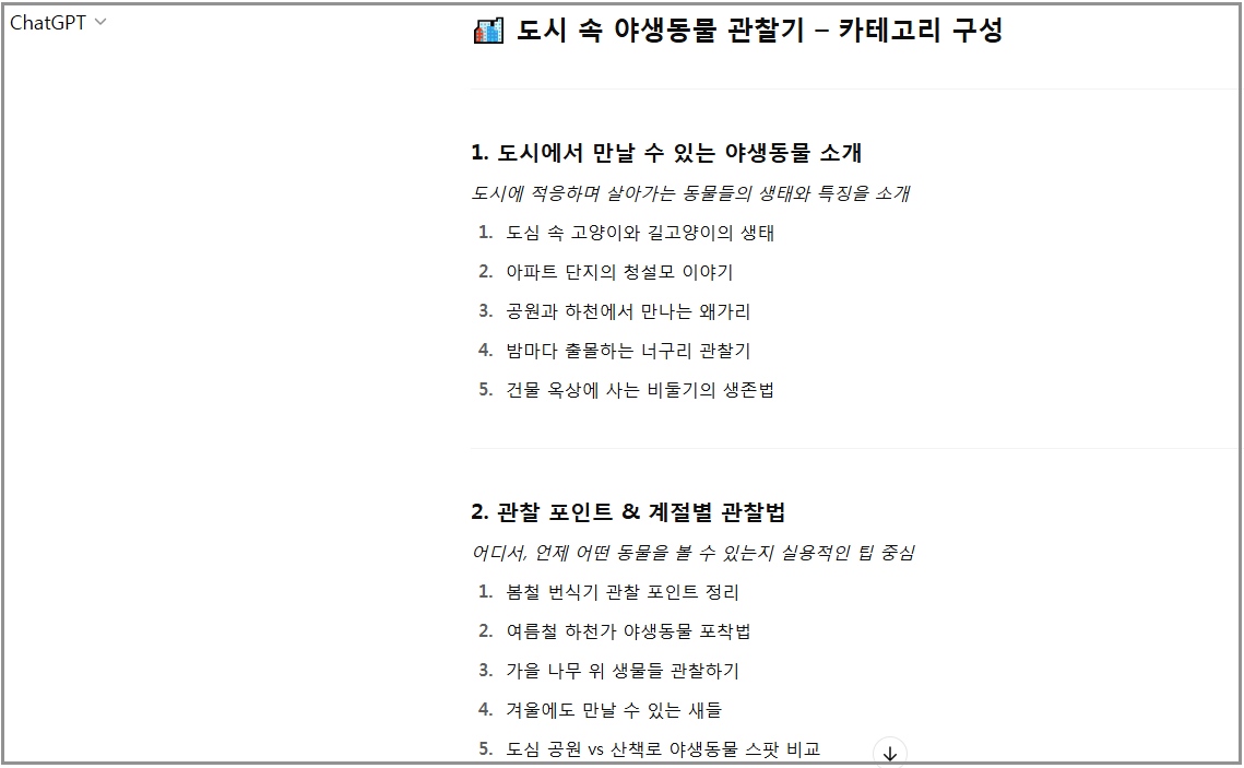 그럼 여기서 메인주제를 선택합니다. (예: '도시 속 야생동물 관찰기') 그다음 아래와 같이 요청합니다.