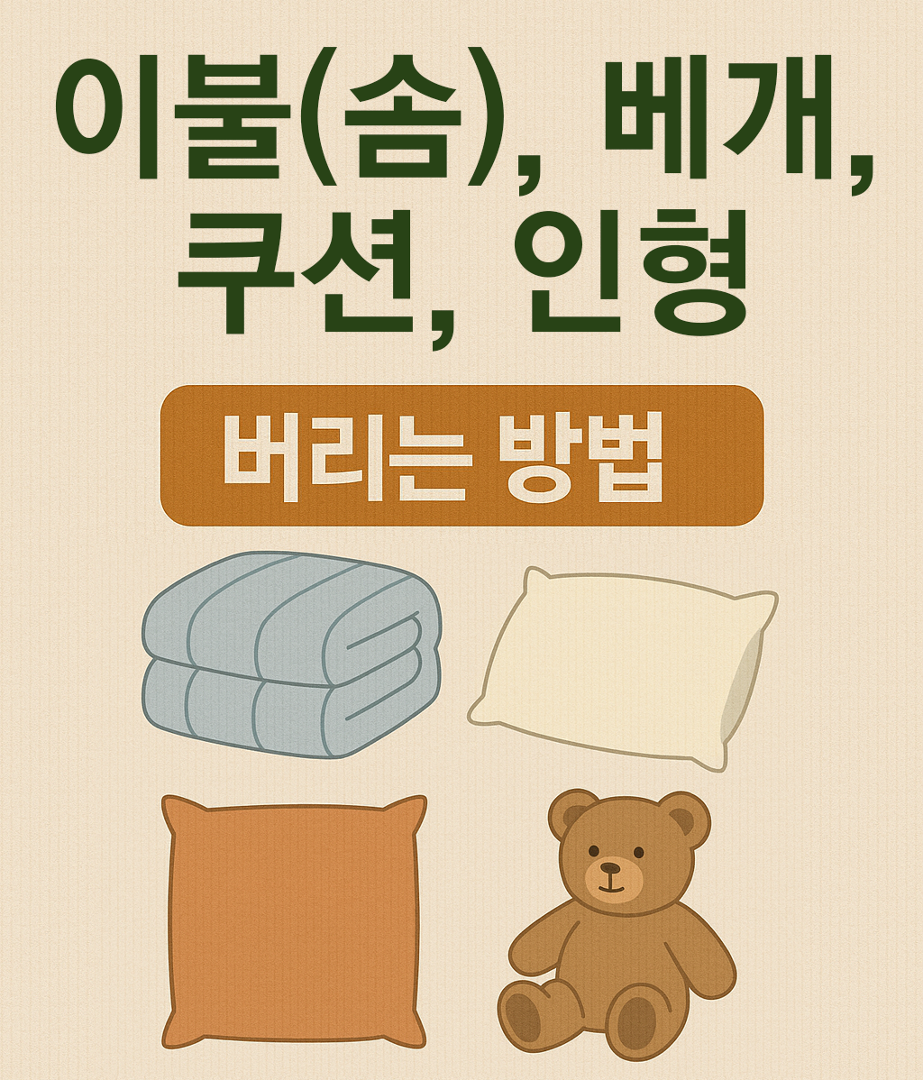 이사나 대청소할 때, 또는 오래된 생활용품을 정리할 때마다 이불(솜), 베개, 쿠션, 인형 같은 부피 큰 물건들, 도대체 어떻게 버려야 하나 고민되신 적 있으시죠? 오늘은 많은 분들이 헷갈려하시는 이불류 폐기 방법을 알기 쉽게 정리해 드리겠습니다.
