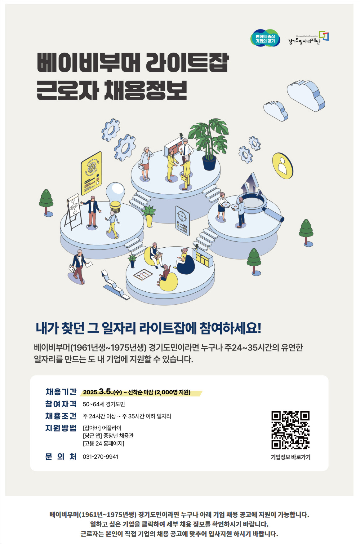경기도민이라면 일자리를 지원받을 수 있는 프로그램이 있어요. 경기도가 중장년층을 위해 ‘베이비부머 라이트잡’이라는 특별한 취업 지원 프로그램을 운영 중입니다.